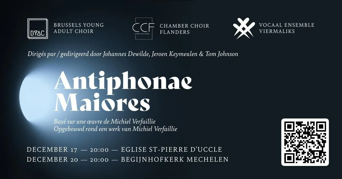 Voor dit bijzondere concert slaan drie koren de handen in elkaar: Chamber Choir Flanders (o.l.v. Jeroen Keymeulen), Viermaliks (o.l.v. Tom Johnson) en het Brussels Young Adult Choir (o.l.v. Johannes Dewilde). In een unieke samenwerking brengen zij de wereldpremière van een nieuw, monumentaal koorwerk van componist Michiel Verfaillie: een hedendaagse toonzetting van de zeven O-antifonen, de eeuwenoude liturgische gezangen waarmee in de week voor Kerstmis naar de komst van Jezus wordt verlangd.